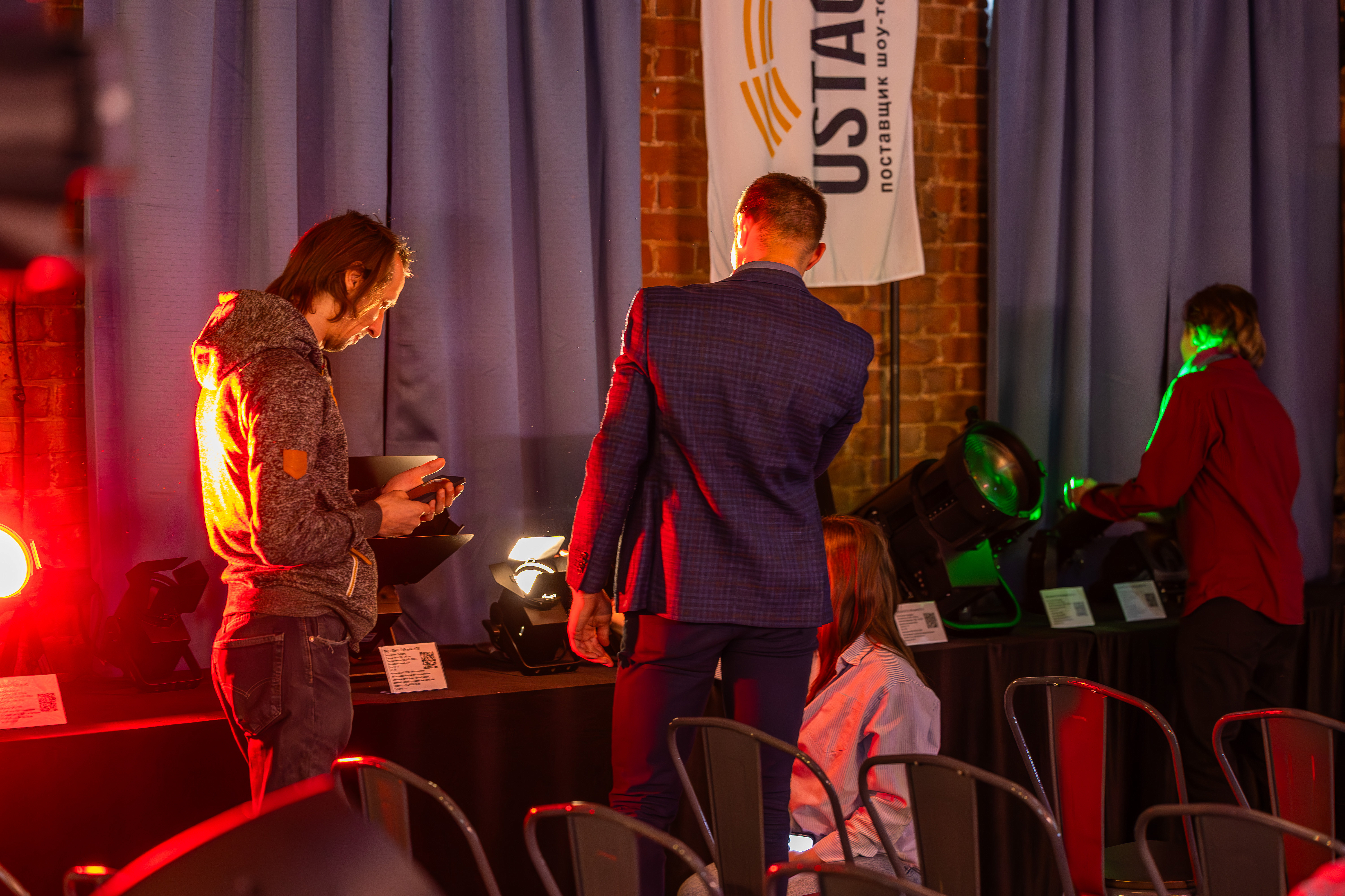 Эксперты USTAGE GROUP подробно рассказали о технических особенностях световых приборов, их применении в различных сценариях — от театральных постановок до крупных шоу и инсталляций. Участникам была представлена актуальная линейка оборудования, включая прожекторы, вращающиеся головы, прожекторы с линзой Френеля и архитектурный свет.